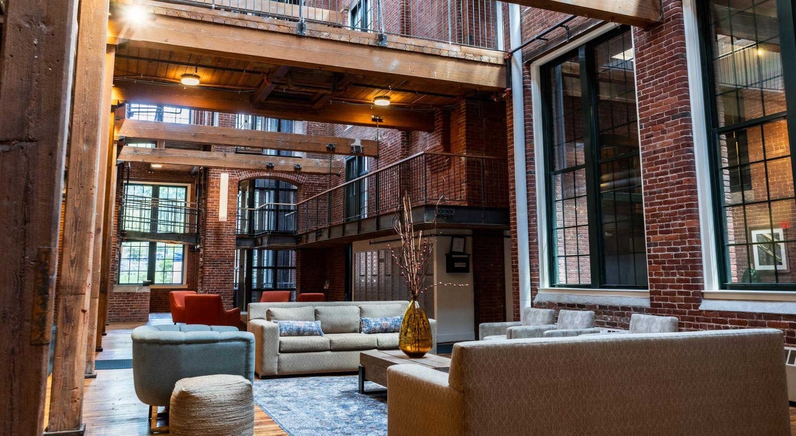 • lounge area with brick themes, accents that reflect modern feelings and lighting