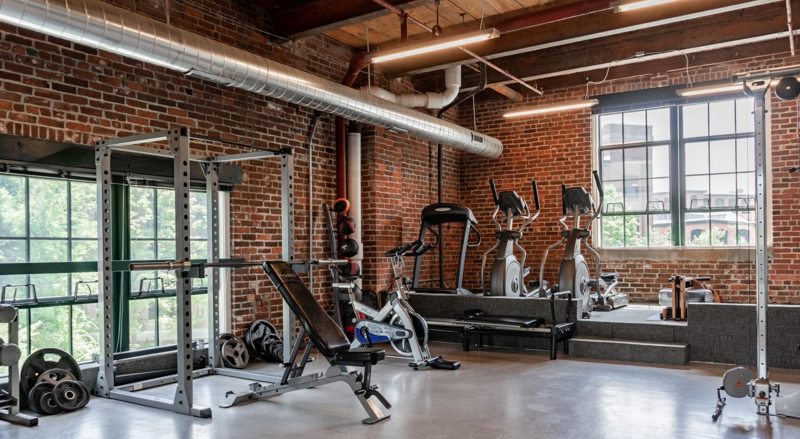 • Aerial view of a historic brick mill building surrounded by trees, with solar panels on the rooftop.