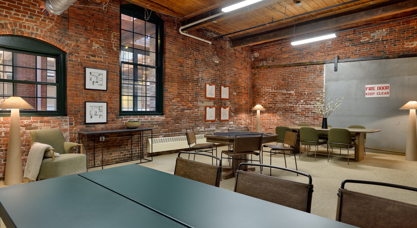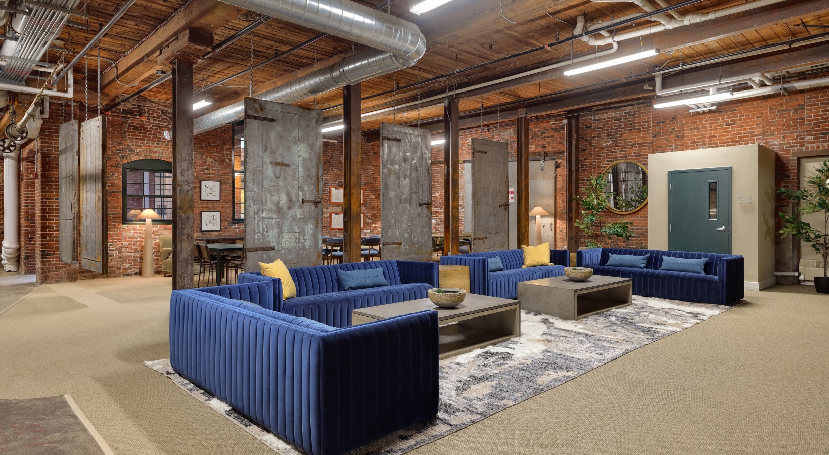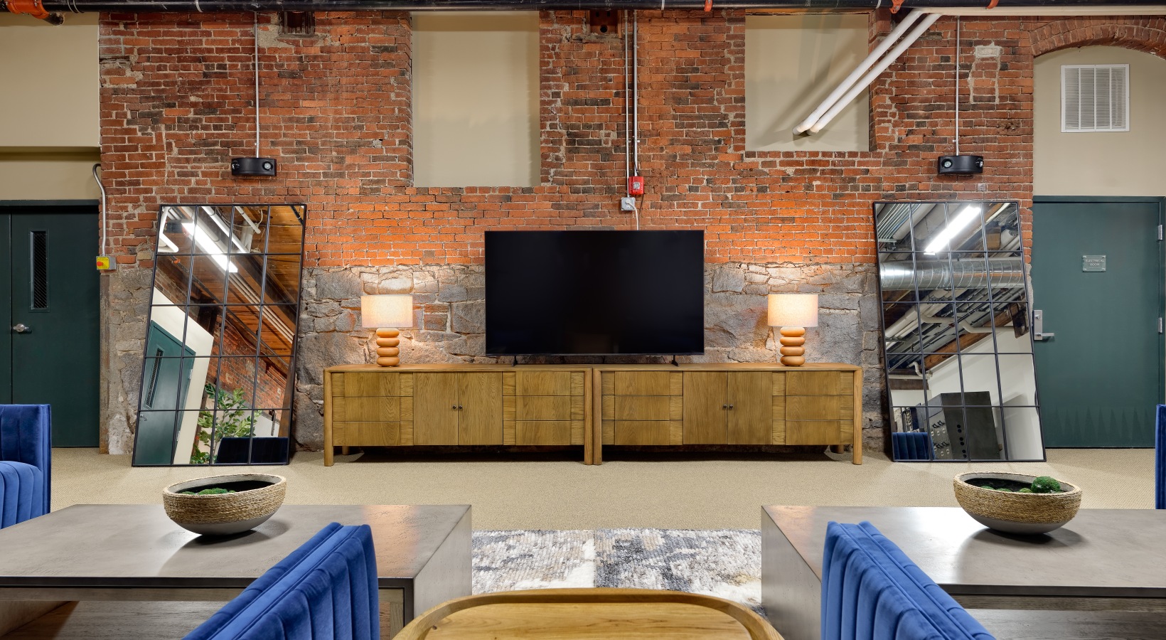 • lounge area with brick themes, accents that reflect modern feelings and lighting