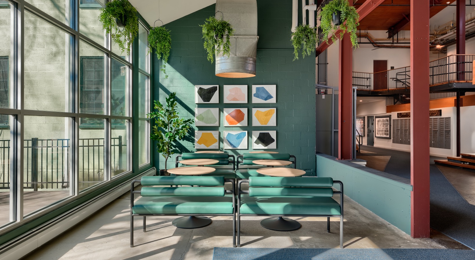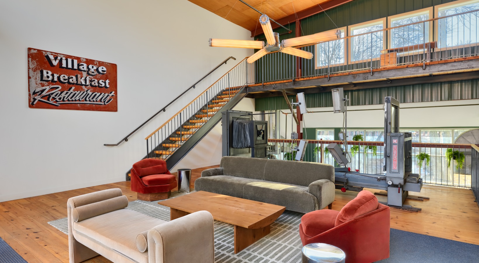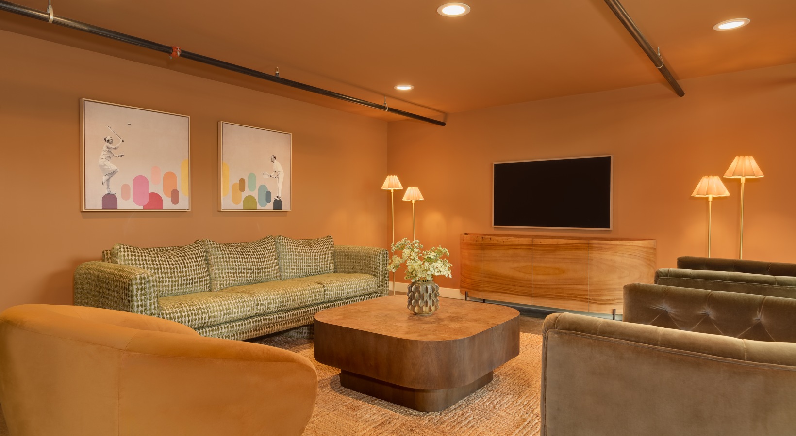• lounge area with brick themes, accents that reflect modern feelings and lighting